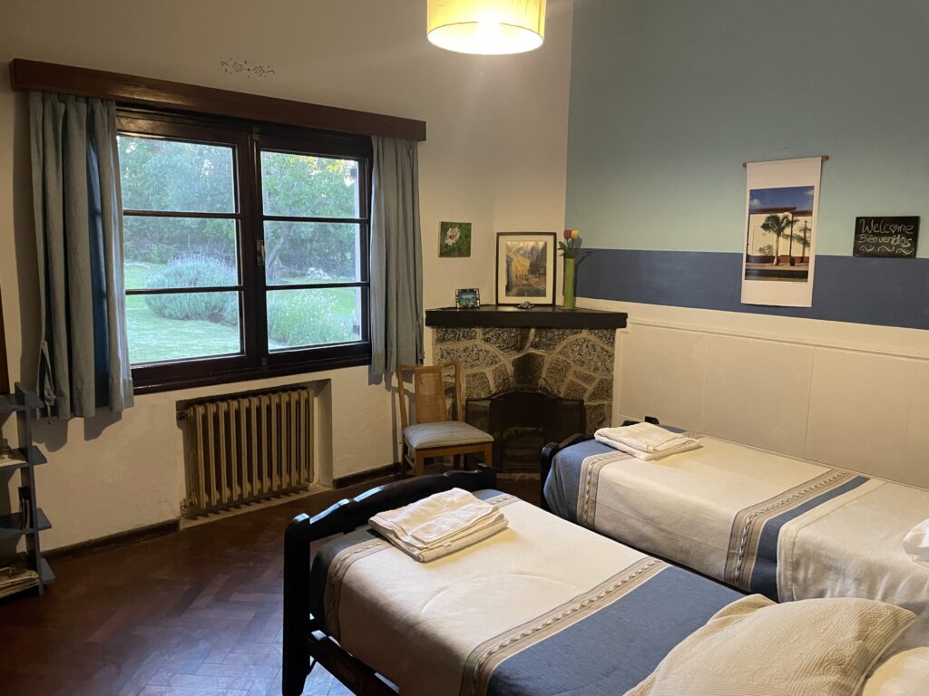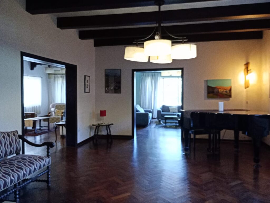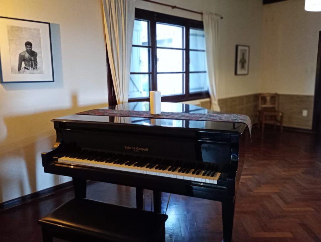 En uno de los salones está el piano de media cola, en otro un sector de living con hogar y Smart TV de 55 pulgadas y en otro un amplio living con hogar.